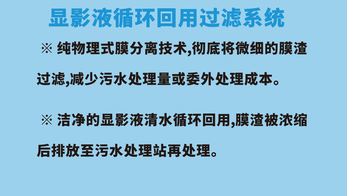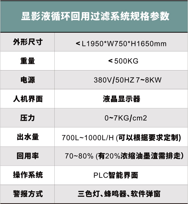 显影液循环回用过滤系统,打破了传统的PCB板显影液的管理方式,不用每天排放,可以循环使用,提高了生产效率,保证了显影点的稳定性,提升了PCB板的生产品质、可大幅减少废水废渣排放,有效利用了水资源,节能环保。