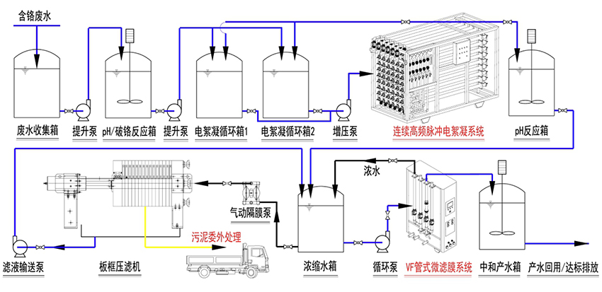 含铬废水中的铬离子属于一类污染物,必须单独收集处理,并充分考虑金属铬的回收利用。含铬废水首先经过连续高频脉冲电离膜系统处理,将六价铬还原为三价铬,并通过pH调节箱沉淀,再流入TMF系统实现固液分离,污泥排外处理。