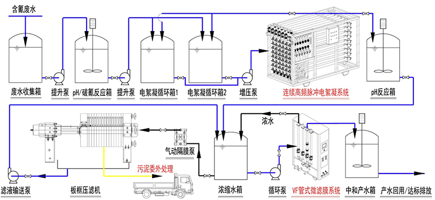 综合废水包含经过预处理的含铬、含氰、高COD废水和其它生产的污水,经过TMF系统处理,后接纳滤系统和离子交换系统,直接回用或深度处理回用。
