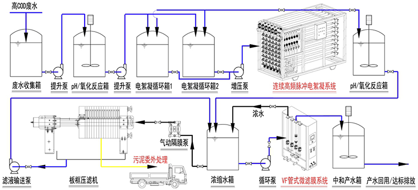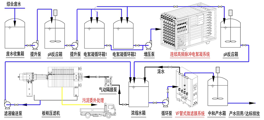 含铜废水的铜离子属于一类污染物,必须单独收集处理,并充分考虑铜的回收利用。含铜废水可分为普通含铜废水和络合含铜废水。其中,普通含铜废水经过pH调节至碱性后直接流入TMF系统处理,金属铜可采用离子交换系统实现资源回收;而络合铜废水单独收集后,首先经过高级氧化系统作预处理,起到了破除铜络合的作用,接着进入连续高频脉冲电离膜系统处理后,再流入TMF系统实现固液分离,压滤得到的铜泥经济价值高,可回收利用。
