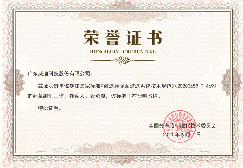 威迪股份受邀作为参编单位参与国家标准计划《微滤膜除菌过滤系统技术规范》的起草;该标准由TC382(全国分离膜标准化技术委员会)归口上报及执行,主管部门为国家标准化管理委员会。拟实施日期:发布后个月正式实施。